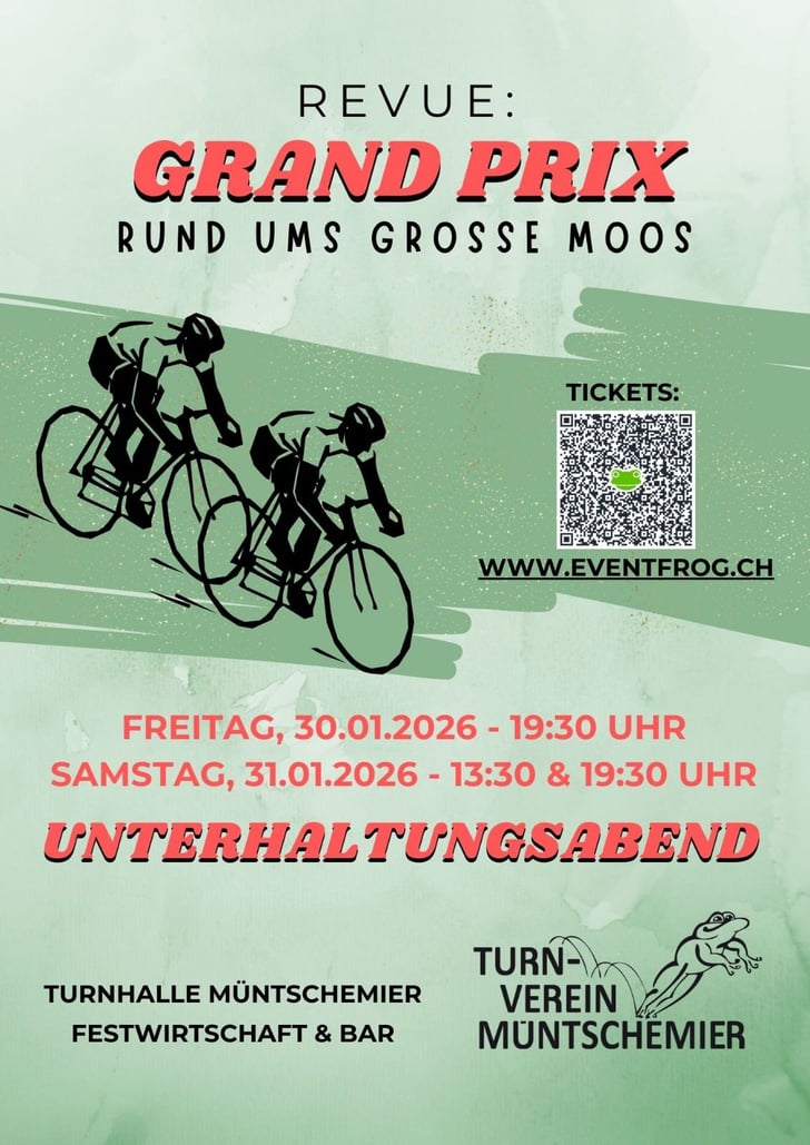 Unter dem Motto „Grand Prix rund ums Grosse Moos“ erlebst du einen abwechslungsreichen Abend mit einem schwungvollen Theater, witzigen und mitreissenden (Tanz-)Einlagen von Klein bis Gross sowie einer Festwirtschaft, die dich zuverlässig durch jeden Boxenstopp führt – Menüs jedoch nur auf Vorbestellung.