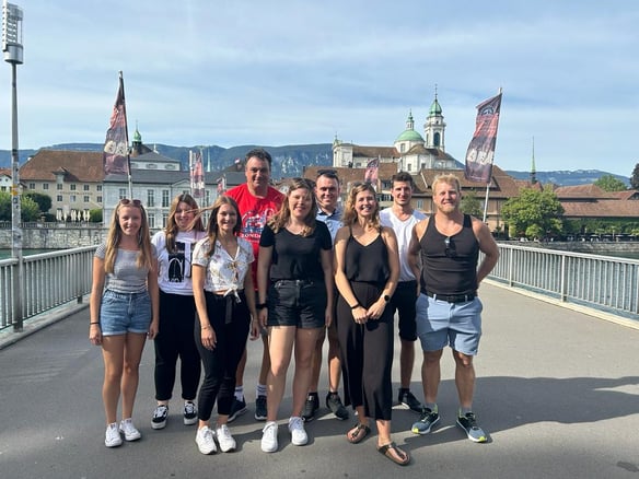 Nun waren alle fit und ready um auch beim Festgelände anzugreifen. Es zeigte sich aber wieder einmal, wie schwierig das an einem so riesigen Event zu organisieren ist. Trotzdem hatten wir es als Verein lustig und genossen den gemeinsamen Abend. Schon kurz nach Mitternacht machte sich der Grossteil der Gruppe auf den Weg zur Unterkunft – eine kleine Weltreise, wie sich herausstellte. Denn just als unser Bus abfahren wollte, fand auf derselben Strecke das legendäre Unterhosenrennen statt. Resultat: nichts ging mehr – ausser dem Walkie-Talkie von Luca, das auf Hochbetrieb lief! Nachdem die „Unterhöseler“ endlich davongelaufen waren, konnten wir mit dem Bus durch die Menschenmenge entlang der Absperrung «eskortiert» werden – selten wurden wir so zur Schau gestellt. In der Unterkunft angekommen, bewies unser Verein erneut Cleverness: Obwohl wir als Letzte eintrafen, hatten wir als Erste die Idee, die weichen Matten aus dem Geräteraum zu holen – ein wahrer Luxus! Die erhoffte Ruhe blieb jedoch aus: Einige Mitglieder hatten offenbar eine Zweitkarriere als Holzfäller geplant… Aber: Man geht ja nicht ans Turnfest, um zu schlafen!